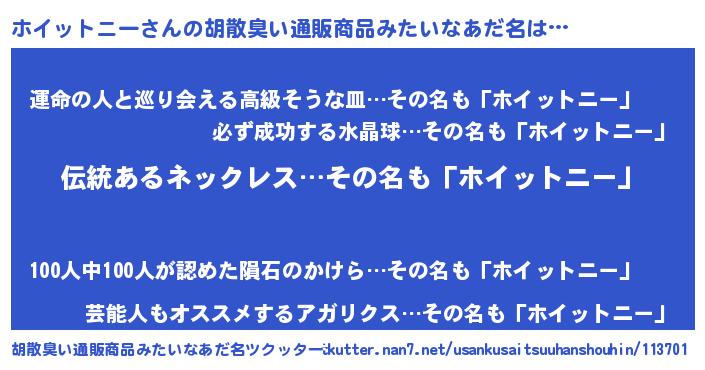 | 男性向けラノベタイトル風あだ名 | 『ホイットニーの嫁は女の子じゃないと思った?』 |