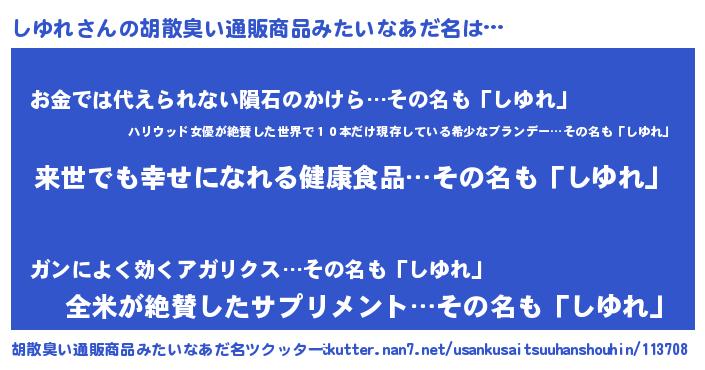 | 男性向けラノベタイトル風あだ名 | 『しゆれに滅ぼされるだけの簡単なお仕事です』 |