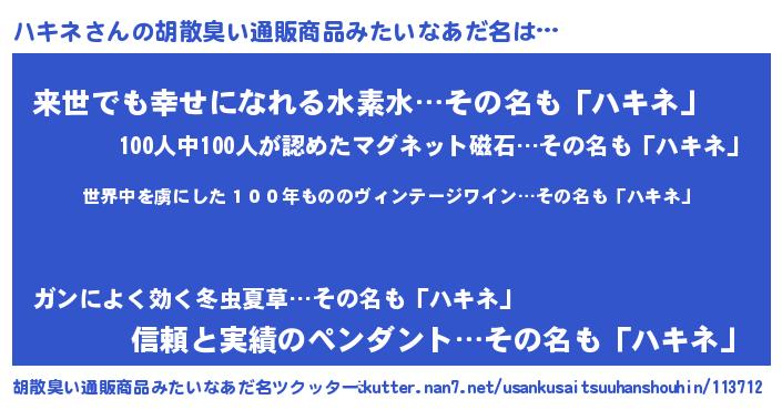 | 意味不明あだ名 | 『住所不定無職ハキネ(6歳)』 |