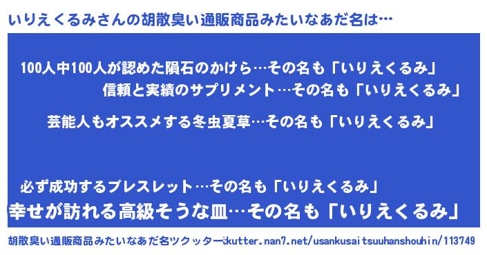 | 男性向けラノベタイトル風あだ名 | 『Re:いりえくるみから始める異世界生活』 |