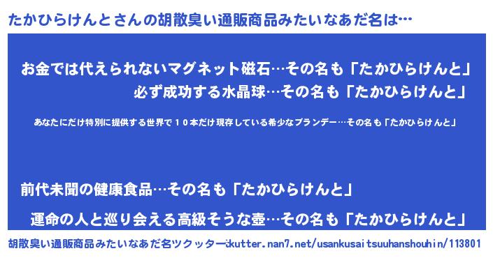 | 意味不明あだ名 | 『住所不定無職たかひらけんと(91歳)』 |