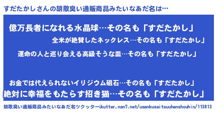 | 男性向けラノベタイトル風あだ名 | 『すだたかしに滅ぼされるだけの簡単なお仕事です』 |