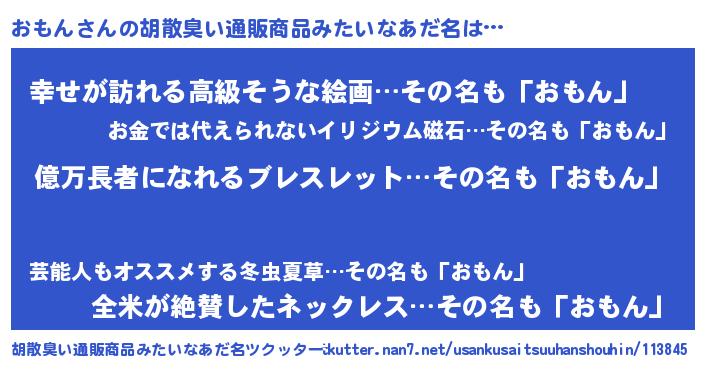 | 男性向けラノベタイトル風あだ名 | 『おもん~年齢イコール彼女いない歴の魔法使い~』 |