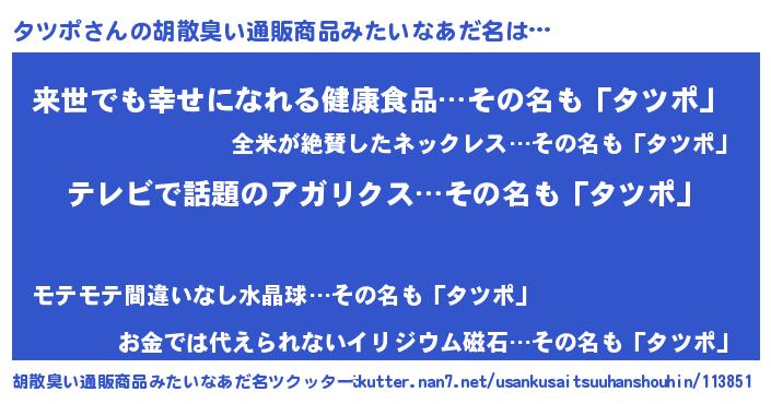 | ヘコむあだ名 | 『タツポ(爆)』『タツっぺ』 |