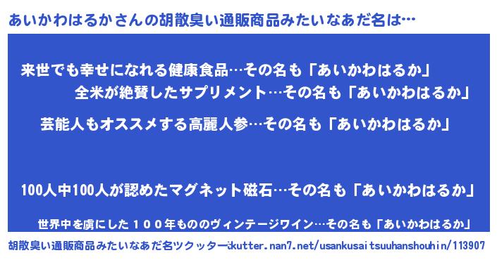 | 可愛いあだ名 | 『あいうちぇる』『あいかわはるかママ』 |