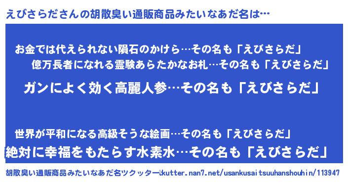 | ヘコむあだ名 | 『えびさらだ(笑)』『えびにゅー』 |