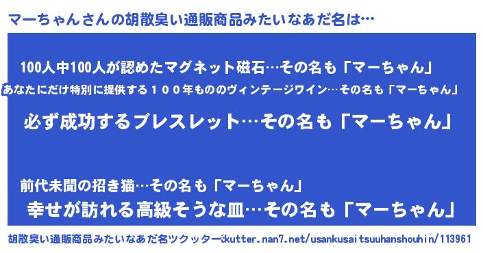| 男性向けラノベタイトル風あだ名 | 『マーちゃんの憂鬱』『緋弾のマーチャン』 |