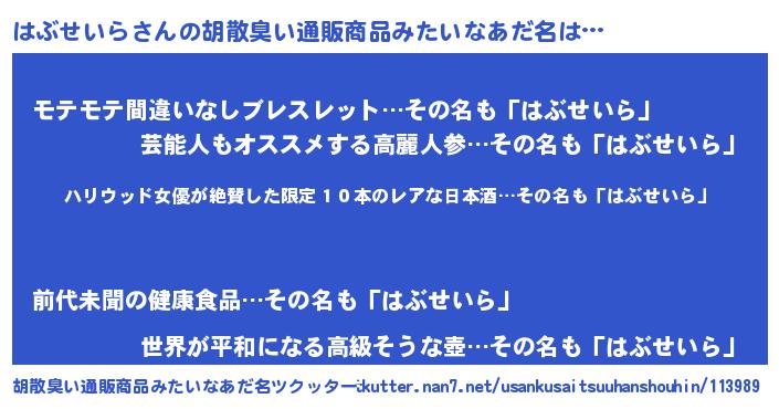 | 意味不明あだ名 | 『住所不定無職はぶせいら(56歳)』 |