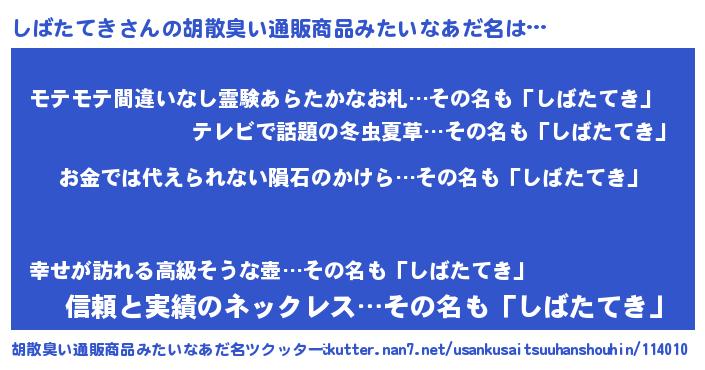 | 男性向けラノベタイトル風あだ名 | 『転生したらしばたてきだった件』 |