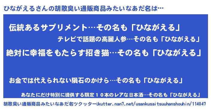 | 男性向けラノベタイトル風あだ名 | 『ひながえるという概念が存在しない退屈な世界 』 |