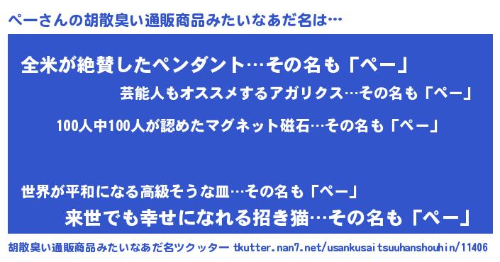 | ヘコむあだ名 | 『ペーお』『ペー(震え声)』『豆乳』 |