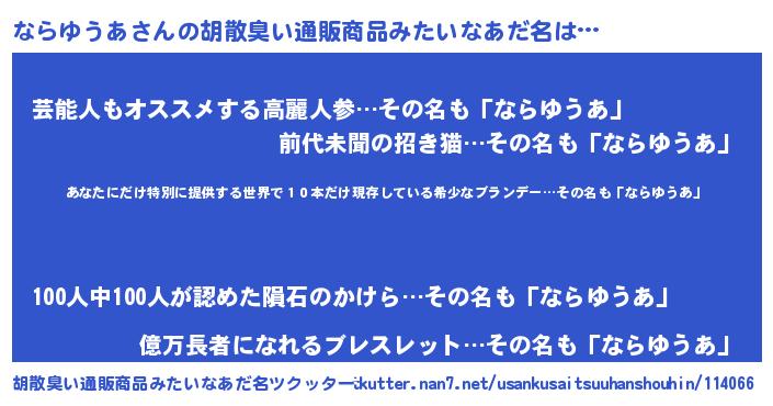 | 意味不明あだ名 | 『住所不定無職ならゆうあ(86歳)』 |