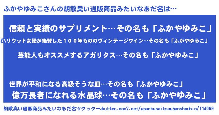 | 男性向けラノベタイトル風あだ名 | 『ふかやゆみこ~年齢イコール彼女いない歴の魔法使い~』 |