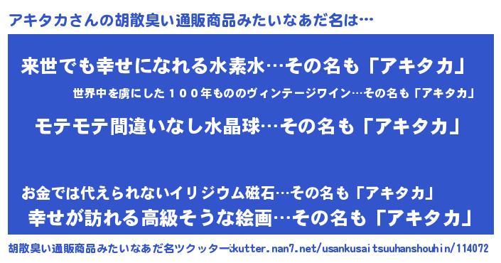 | 男性向けラノベタイトル風あだ名 | 『アキタカアートオンライン』 |