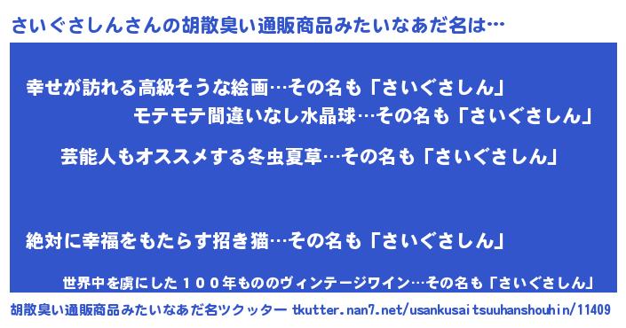 | 男性向けラノベタイトル風あだ名 | 『Re:さいぐさしんから始める異世界生活』 |