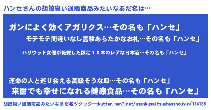 | 意味不明あだ名 | 『住所不定無職ハンセ(62歳)』『自称ハンセ』 |