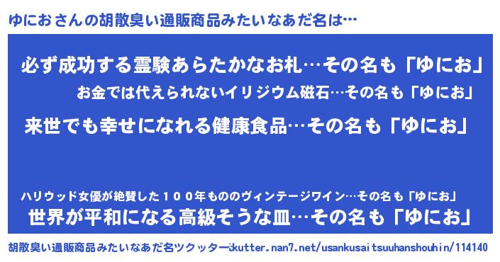 | 男性向けラノベタイトル風あだ名 | 『ゆにおという概念が存在しない退屈な世界 』 |