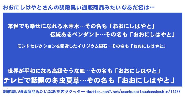 | 男性向けラノベタイトル風あだ名 | 『ノーゲーム・ノーオオニシハヤト』 |