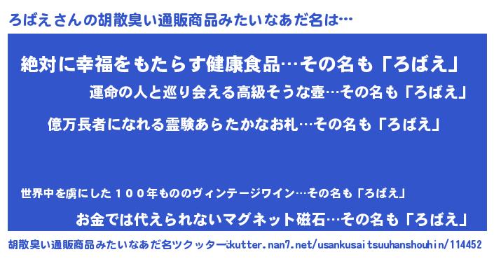 | ヘコむあだ名 | 『ろばっふぃ~』『ろばえ(遠い目)』 |