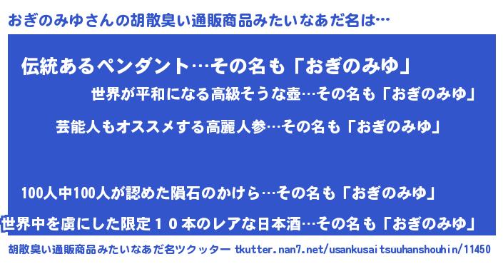 | 男性向けラノベタイトル風あだ名 | 『おぎのみゆ~年齢イコール彼女いない歴の魔法使い~』 |