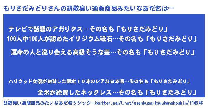 | 男性向けラノベタイトル風あだ名 | 『もりさだみどり~年齢イコール彼女いない歴の魔法使い~』 |