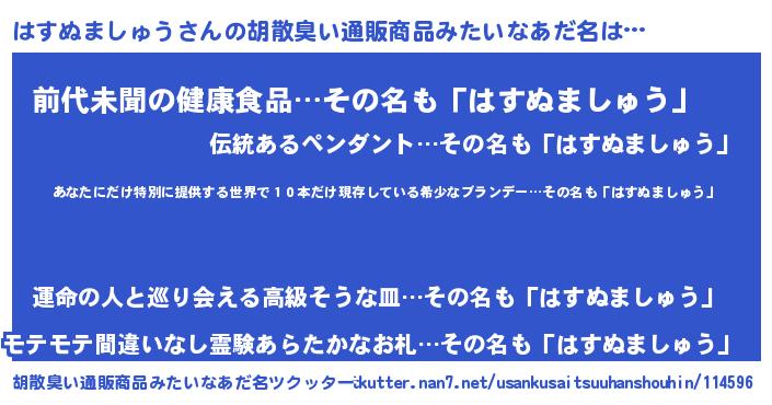 | ヘコむあだ名 | 『はすぬましゅう(震え声)』『はすにゅー』 |