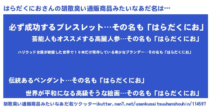 | 男性向けラノベタイトル風あだ名 | 『はたらくはらだくにおさま!』 |