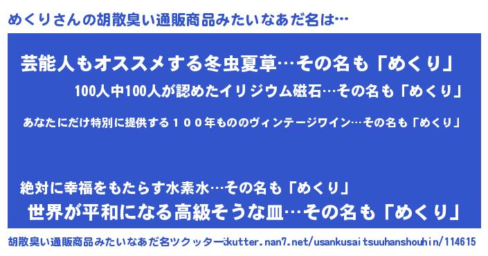 | 男性向けラノベタイトル風あだ名 | 『めくりに滅ぼされるだけの簡単なお仕事です』 |