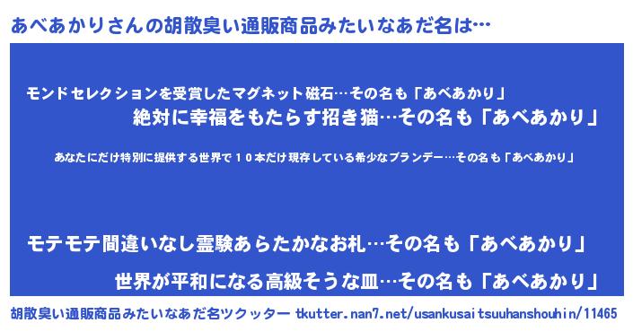 | 意味不明あだ名 | 『住所不定無職あべあかり(91歳)』 |