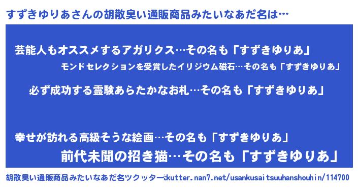 | ヘコむあだ名 | 『すずもー』『すずきゆりあ(爆)』 |