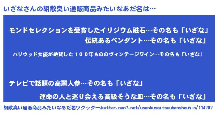 | 男性向けラノベタイトル風あだ名 | 『イザナスレイヤー』『魔弾の王といざな』 |