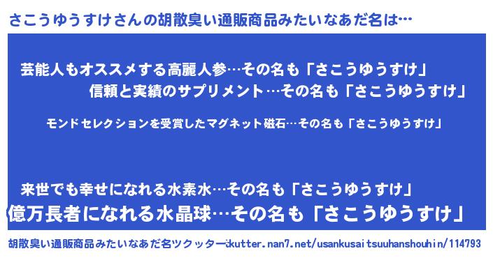 | 男性向けラノベタイトル風あだ名 | 『さこうゆうすけ~年齢イコール彼女いない歴の魔法使い~』 |