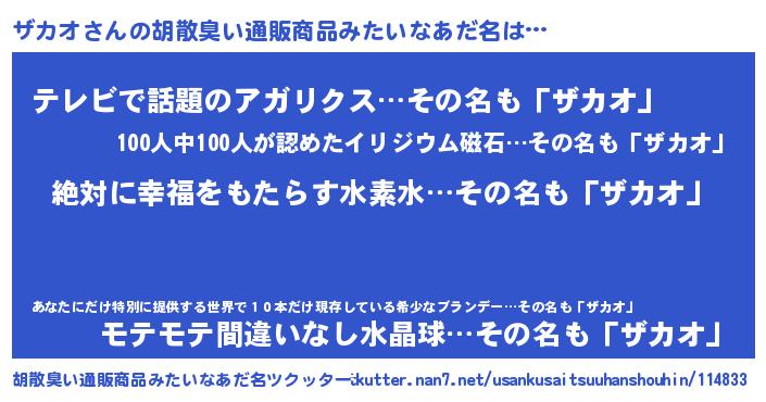 | 男性向けラノベタイトル風あだ名 | 『ザカオという概念が存在しない退屈な世界 』 |