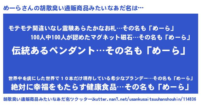 | 男性向けラノベタイトル風あだ名 | 『ダンジョンにめーらを求めるのは間違っているだろうか』 |
