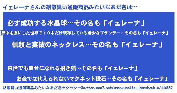| 意味不明あだ名 | 『とにかく怪しいイェレーナ』 |