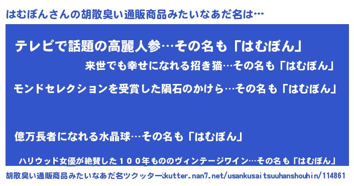 | 女子向けラノベタイトル風あだ名 | 『死神はむぼんの再婚』『闇のはむぼん』 |