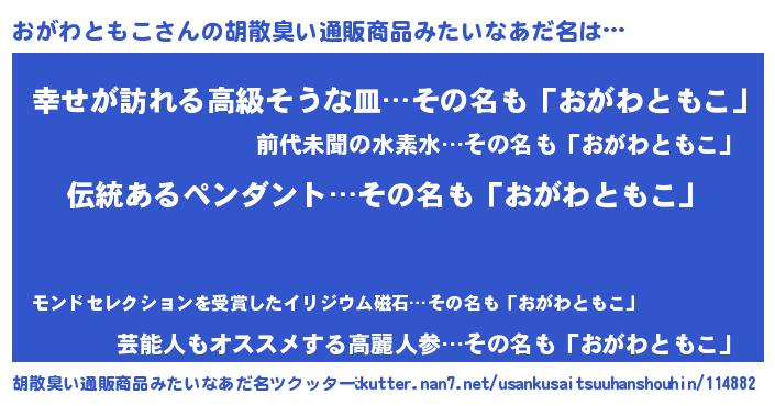 | 欧米人風あだ名 | 『ウサインおがわともこ』 |