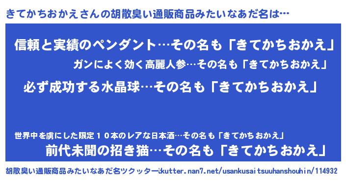 | 男性向けラノベタイトル風あだ名 | 『きてかちおかえの憂鬱』 |