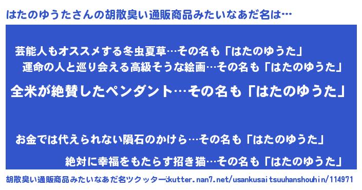 | ヘコむあだ名 | 『はたっぺ』『はたのゆうた(遠い目)』 |