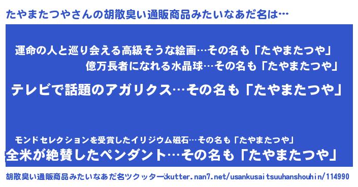 | 男性向けラノベタイトル風あだ名 | 『Re:たやまたつやから始める異世界生活』 |