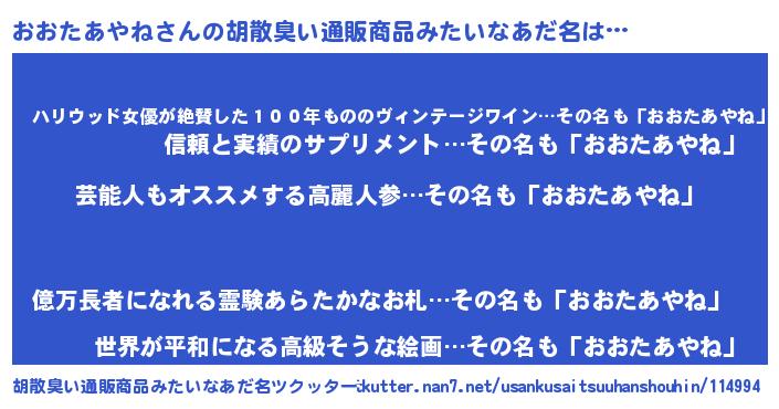 | 男性向けラノベタイトル風あだ名 | 『Re:おおたあやねから始める異世界生活』 |