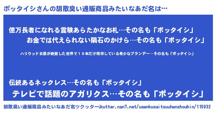 | 意味不明あだ名 | 『住所不定無職ポッタイシ(91歳)』 |