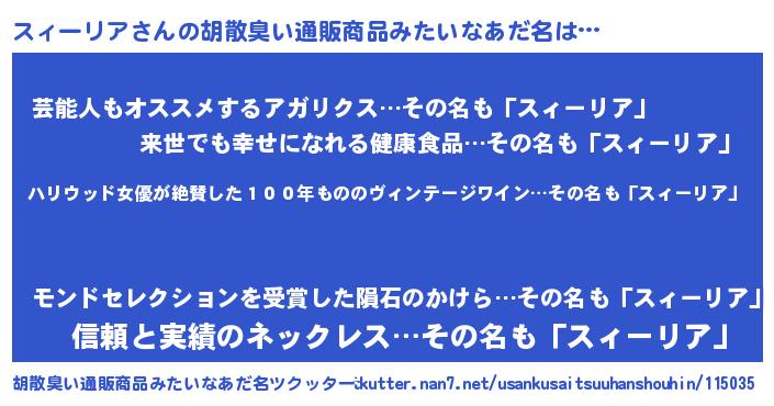 | 意味不明あだ名 | 『住所不定無職スィーリア(6歳)』 |