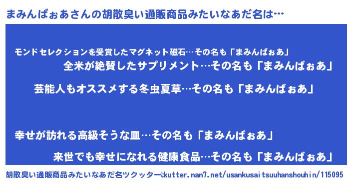 | 男性向けラノベタイトル風あだ名 | 『Re:まみんばぉあから始める異世界生活』 |
