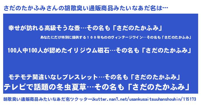 | 男性向けラノベタイトル風あだ名 | 『おまえをオタクにしてやるから、俺をさだのたかふみにしてくれ! 』 |