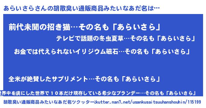 | ヘコむあだ名 | 『あらいさら(笑)』『あらを』 |
