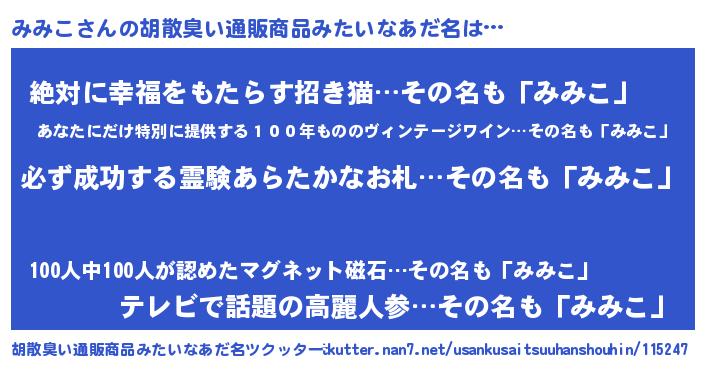 | 欧米人風あだ名 | 『マイケルみみこ』『ダルビッシュみみこ』 |