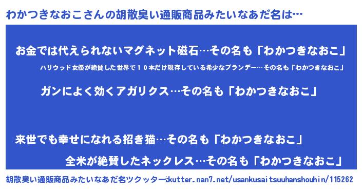 | ヘコむあだ名 | 『わか太郎』『わかつきなおこ(笑)』 |