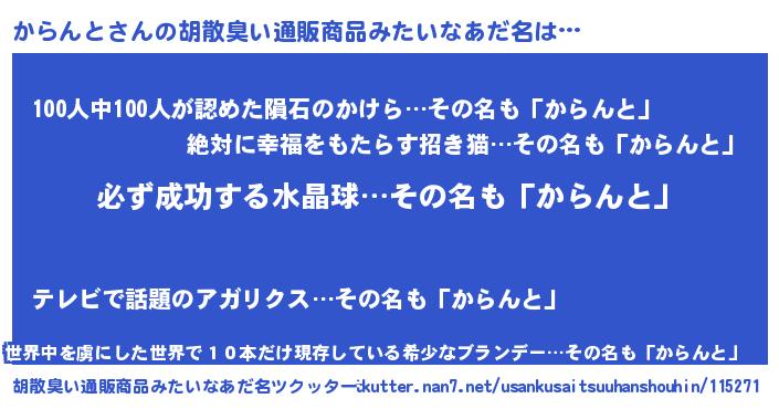 | 男性向けラノベタイトル風あだ名 | 『からんとの憂鬱』『魔弾の王とからんと』 |