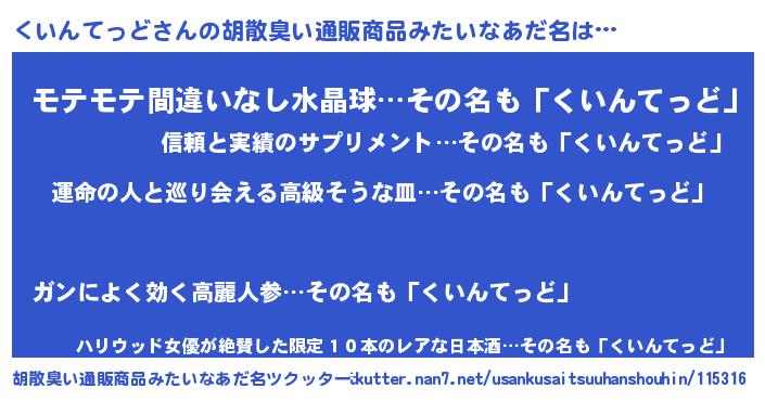 | 男性向けラノベタイトル風あだ名 | 『くいんてっど~年齢イコール彼女いない歴の魔法使い~』 |